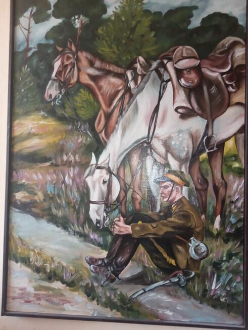 sprzedam obraz olejny na płótnie wymiary 46cmx65cm z roku 1988 replika obrazu Wojciecha Kossaka odpoczynek ułana w stanie ...