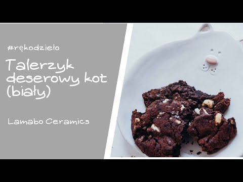 3Ceramiczny biały talerzyk deserowy w kształcie kota, z kocimi uszkami, zawiniętym ogonem i uśmiechem. Talerzyk może ...